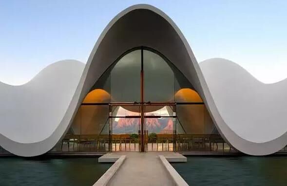 整個教堂就是一片被“軟化”的混凝土片,飄浮著嵌在四片玻璃上。這片混凝土通過優(yōu)雅地起伏完成自我支撐,同時營造出一個完整獨立的空間。十字架與窗框結合,完整且恰到好處。四周的景色在起伏的屋頂曲線的“剪切”下呈現(xiàn)出對稱、均衡的完美構圖。