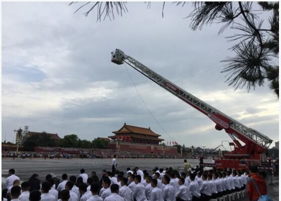 此外,為滿(mǎn)足各種拍攝條件,央視還精選了中聯(lián)重科56米泵車(chē)和32米云梯消防車(chē)。56米泵車(chē)可謂是大號(hào)“攝像搖臂”,在其臂架前端架設(shè)攝像機(jī)輔助拍攝閱兵隊(duì)伍行進(jìn)的動(dòng)態(tài)長(zhǎng)鏡頭。32米云梯消防車(chē)則是超高的“拍攝平臺(tái)”,央視的“長(zhǎng)頸鹿攝像機(jī)”架設(shè)在高度32米的消防平臺(tái)上,攝像師站在平臺(tái)上捕捉受閱裝備彎道轉(zhuǎn)彎的精彩畫(huà)面,體現(xiàn)鋼鐵洪流卷起滾滾烽煙。在前期,云梯消防車(chē)還承擔(dān)了輔助架設(shè)“天鷹”的重任。