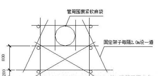 ③.樓板處留洞固定泵管如下圖。在首層及其它樓層頂板予留直徑250mm的圓洞便于穿管。管周圍用木楔楔緊,不少于四個。