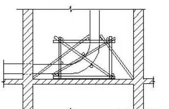 1.泵管隨層接,澆注墻體及柱混凝土時,端頭軟管放在該施工位置的操作架上,輸送管路必須使?jié)补嗖课辉诠ぷ靼霃街畠?nèi)。由于留洞口到操作位置需接90o彎管和平直管,保證平直管高出模板頂1M,彎管及平直管必須臨時固定牢固,搭設類似前圖所示的固定架子,保證泵管穩(wěn)定。