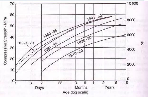 另一個(gè)特點(diǎn),水泥膠砂強(qiáng)度的變化很大,主要是固定水膠比的7d強(qiáng)度顯著增長,28d強(qiáng)度也是增強(qiáng)的很厲害。但是,另一個(gè)很重要的指標(biāo)卻沒進(jìn)步過,那就是28d齡期之外的強(qiáng)度。我們知道在1970年需要0.50的水灰比,混凝土立方體強(qiáng)度才能達(dá)到32.5MPa。而1984年則需要0.57的水灰比。保持混凝土的每立方米用水量為相同的175kg/m3,假定工作性能保持一致,即則水泥用量從350kg/m3降低到307kg/m3。為了更易被碳化或被侵蝕物質(zhì)滲透,我們慢慢采用更高水膠比和更低水泥用量來使得混凝土具有更高滲透性,這樣的話,一般混凝土耐久性就更低了。與使用“舊”水泥的混凝土相比,快速獲得早期強(qiáng)度也意味更早獲得足夠的拆模強(qiáng)度,這樣就停止了早期有效養(yǎng)護(hù)。從而使混凝土性能不能得到長期改善。