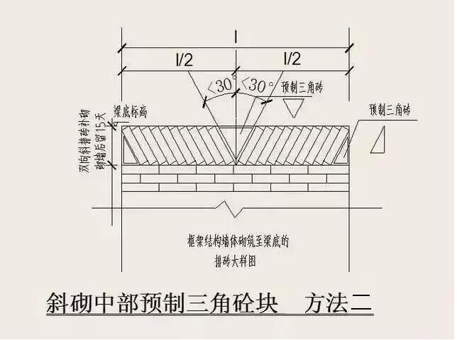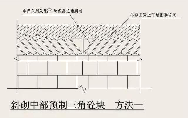 6)砌體頂部斜頂磚要求:砌到接近上層梁、板底約200mm,浮磚壓頂待下部砌體沉縮。在抹灰前(間 隔時間不少于14天),宜用實心磚斜砌擠緊,磚傾斜度為60度左右,砂漿應飽滿,如圖所示: