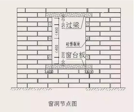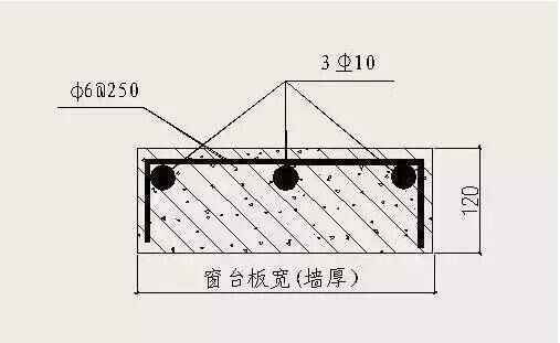 對于砌體墻,外窗洞下口必須澆筑寬與墻厚相同、高度不小于120mm、長度每邊伸入墻內(nèi)不少于400mm(不足400mm時通長設置)的混凝土窗臺板(針對窗臺下砌體八字縫措施),已設鋼筋混凝土凸窗套或窗臺板者除外。窗臺板為C20混凝土,內(nèi)配3Φ10主筋和φ6@250U型分布筋。
