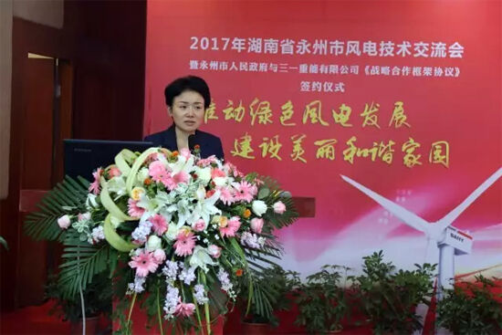 永州市委書記、市人大常委會主任李暉出席并講話,永州市委副書記、市長易佳良致辭,三一集團(tuán)董事、三一重能董事長周福貴致辭,湖南省能源局副局長吳波,三一集團(tuán)董事、三一重能副董事長毛中吾出席。永州市副市長嚴(yán)興德主持簽約儀式。