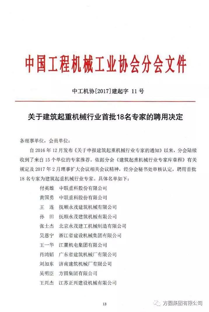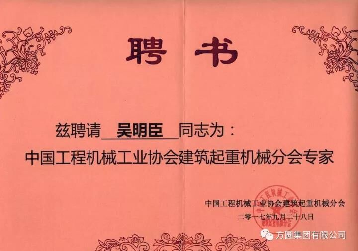 在11月9日召開的中國工程機(jī)械工業(yè)協(xié)會建筑起重機(jī)械分會年會上,以中工機(jī)協(xié)【2017】建起字11號文件公布了《關(guān)于建筑起重機(jī)械行業(yè)首批18名專家的聘用決定》,聘用首批18名專家為建筑起重機(jī)械行業(yè)專家,方圓集團(tuán)副總工程師吳明臣名列其中。