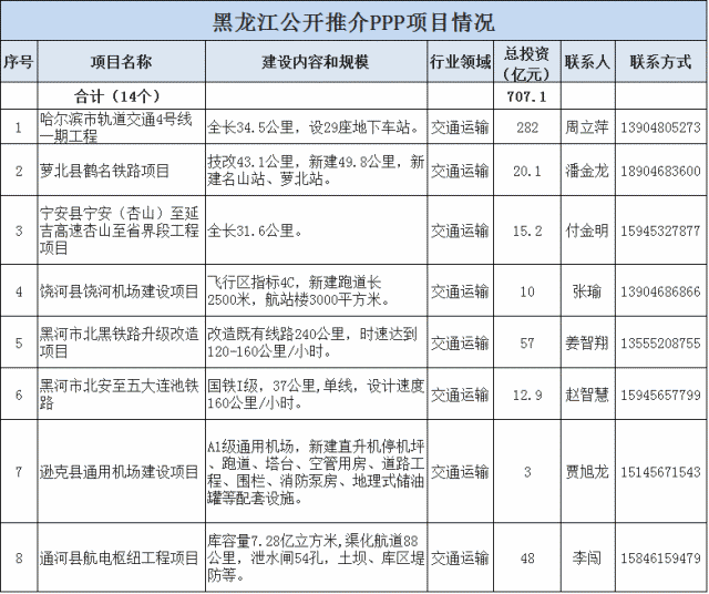 黑龍江省發(fā)改委、財政廳聯(lián)合推介交通運輸、水利、重大市政工程等14個PPP項目,總投資707.1億元。