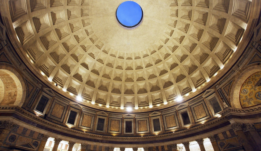 穹頂頂部的矢高和直徑一樣,也是43.3米,這樣,萬神殿的剖面恰好可以容得下一個整圓,而它的內(nèi)部墻面兩層分割也接近于黃金分割,因此它常被作為通過幾何形式達到構(gòu)圖和諧的古代實例。