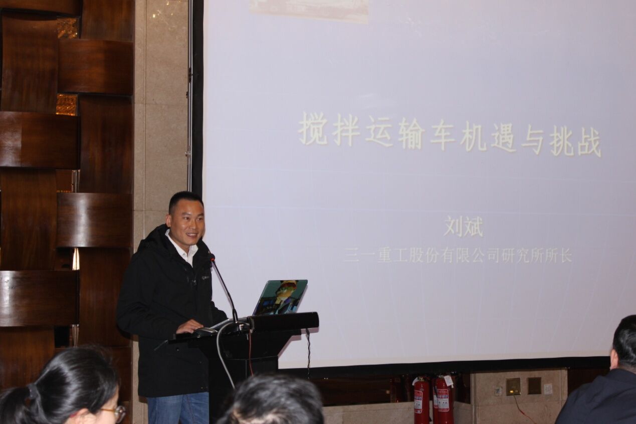 三一重工股份有限公司研究所所長劉斌先生作了《攪拌運輸車機遇與挑戰(zhàn)》的主題報告,從攪拌車面臨的五大機遇和三大挑戰(zhàn)分析,提出攪拌車的研發(fā)與生產(chǎn)要回歸本質,即運輸和質量,保證安全運輸、環(huán)保運輸、合標運輸、保證運輸?shù)幕炷临|量。