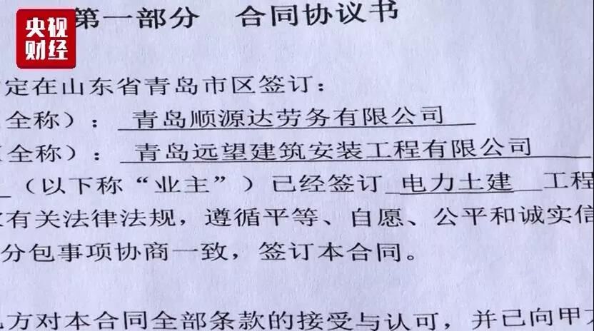 劉飛云介紹,該標(biāo)段總承包方為中國(guó)葛洲壩集團(tuán)電力有限責(zé)任公司,總承包方通過(guò)青島永利捷電力工程有限公司、青島順源達(dá)勞務(wù)有限公司等層層分包,最終由他所在的青島遠(yuǎn)望建筑安裝工程有限公司實(shí)際施工。