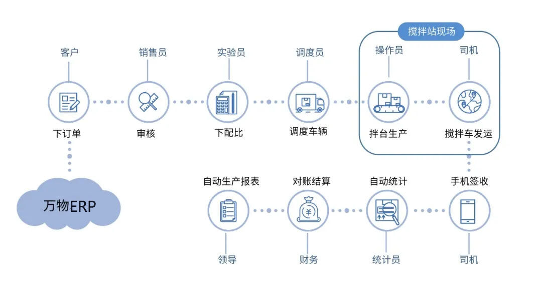 萬(wàn)物ERP依托工業(yè)互聯(lián)網(wǎng)平臺(tái)技術(shù),將攪拌站大部分工作人員從攪拌站現(xiàn)場(chǎng)解放出來(lái),在總部、在工地、在家中,不分白天黑夜,均能參與生產(chǎn)管理。