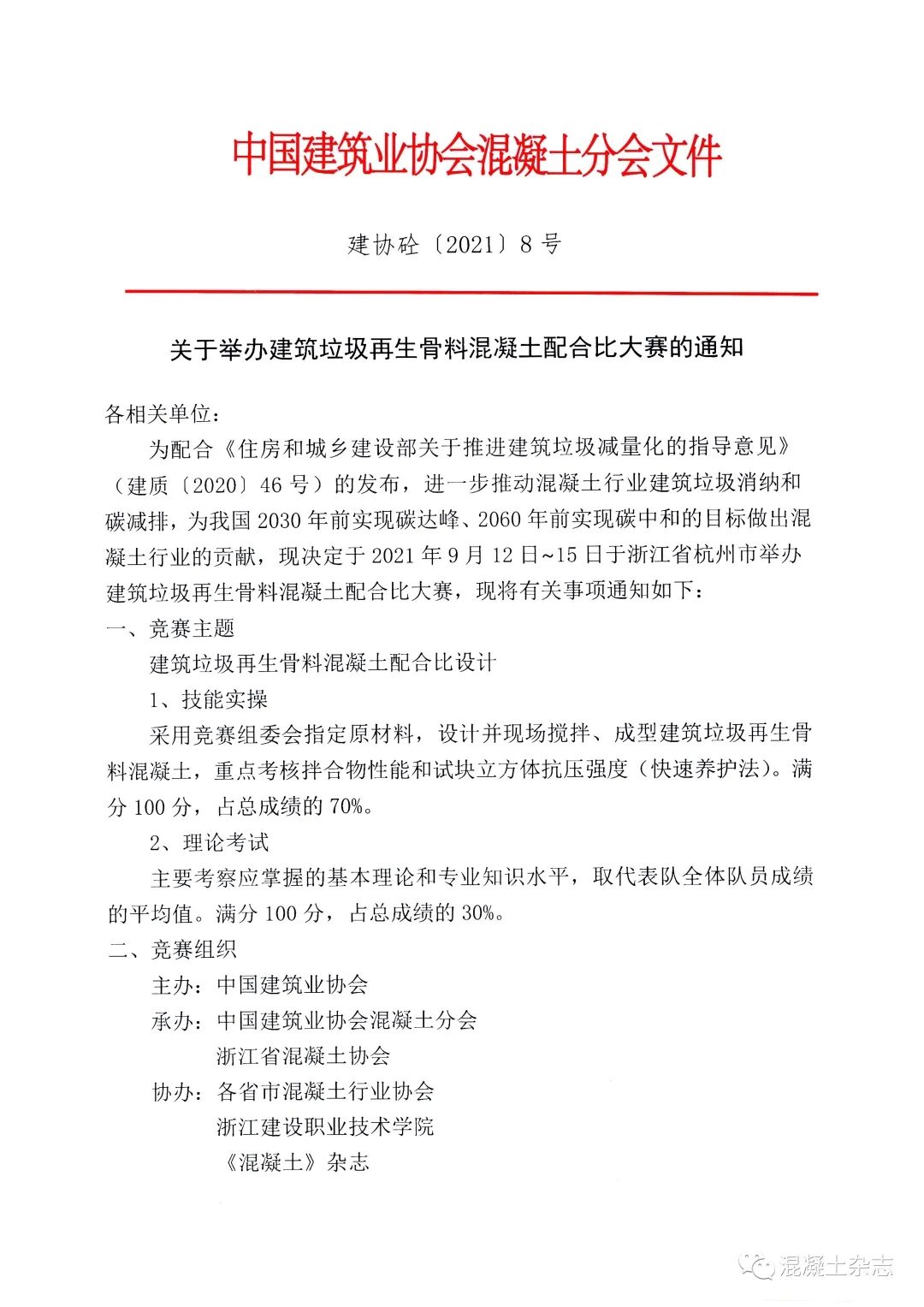 為配合《住房和城鄉(xiāng)建設(shè)部關(guān)于推進(jìn)建筑垃圾減量化的指導(dǎo)意見》(建質(zhì)〔2020〕46號(hào))的發(fā)布,進(jìn)一步推動(dòng)混凝土行業(yè)建筑垃圾消納和碳減排,為我國2030年前實(shí)現(xiàn)碳達(dá)峰、2060年前實(shí)現(xiàn)碳中和的目標(biāo)做出混凝土行業(yè)的貢獻(xiàn),現(xiàn)決定于2021年9月12日~15日于浙江省杭州市舉辦建筑垃圾再生骨料混凝土配合比大賽。