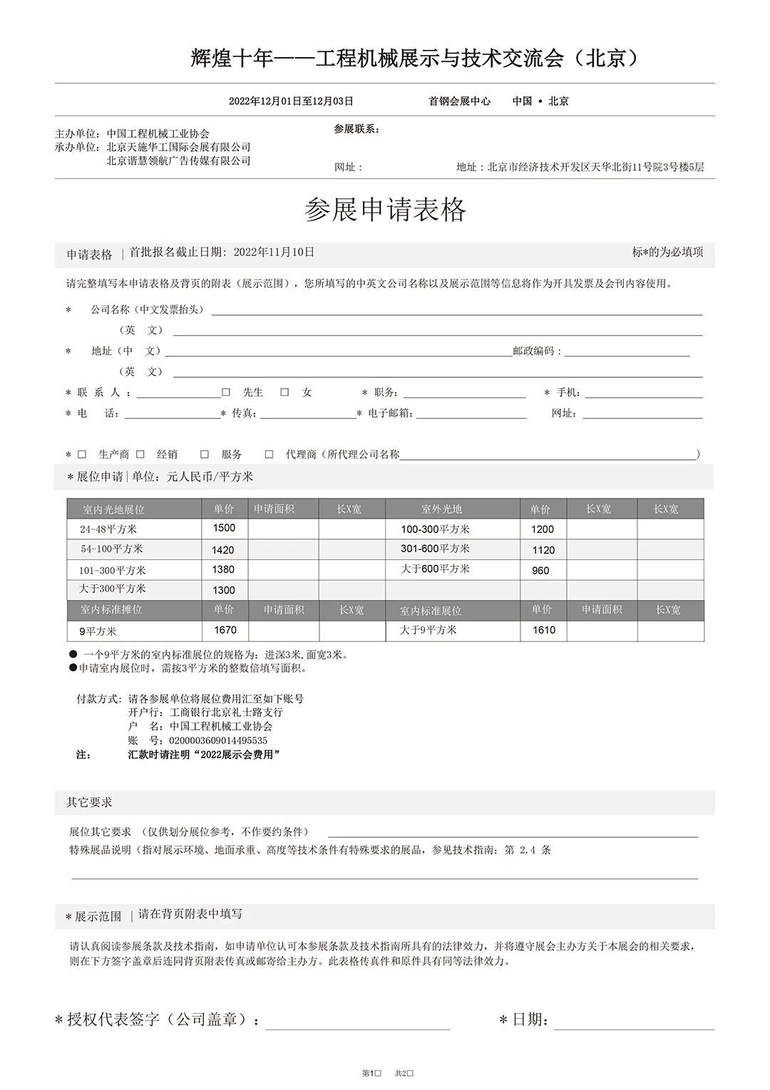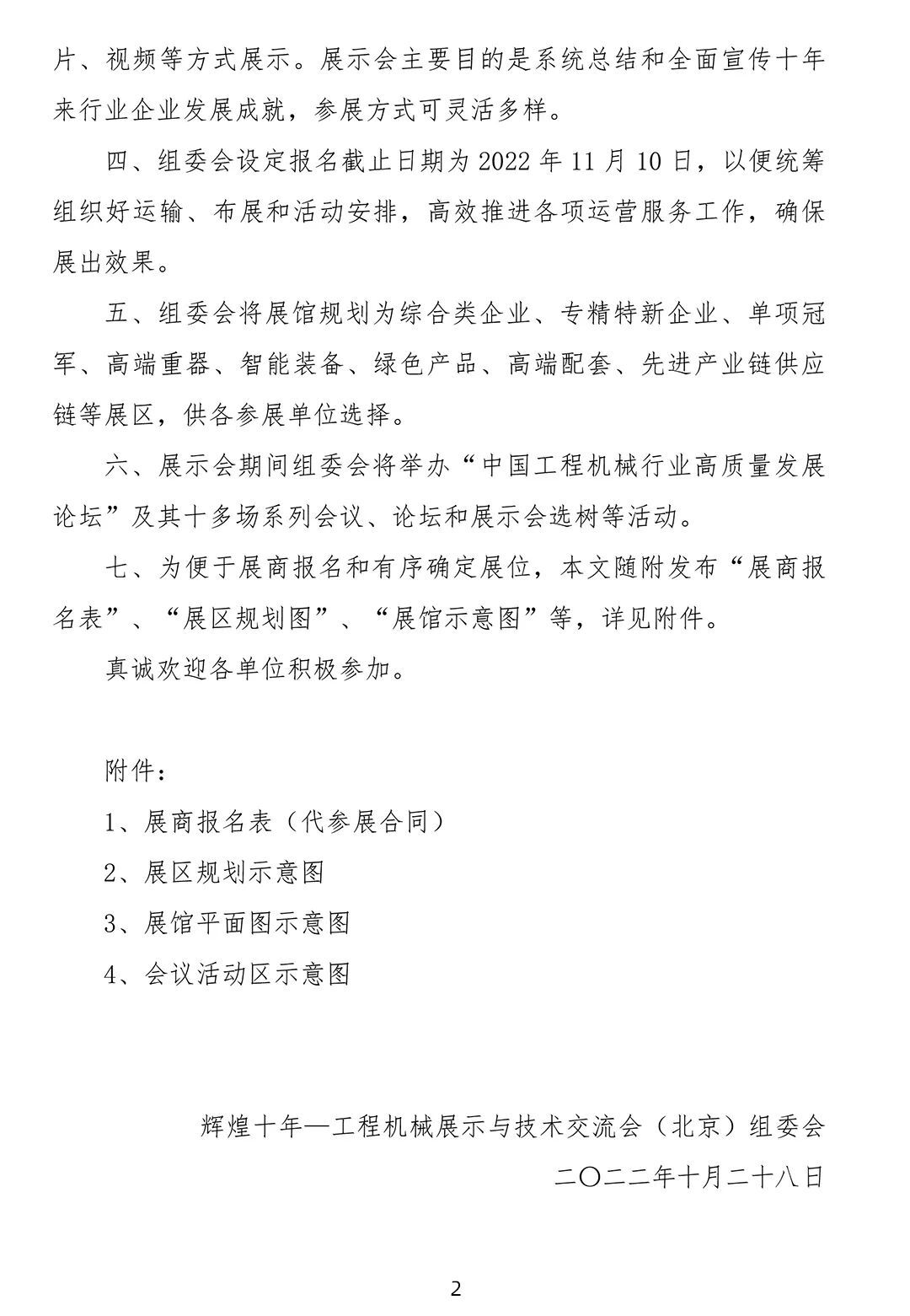 自協(xié)會(huì)發(fā)布舉辦“輝煌十年——工程機(jī)械展示與技術(shù)交流會(huì)(北京)”(以下簡(jiǎn)稱“展示會(huì)”)通知后,得到了各參展單位的快速響應(yīng)和積極支持,有的已經(jīng)報(bào)名大面積參展,有的正在履行審批程序或來(lái)電表示參加展出,組委會(huì)深表衷心感謝!為及時(shí)傳遞展會(huì)信息,服務(wù)好廣大展商,辦好本次展示會(huì),現(xiàn)向廣大展商正式發(fā)出邀請(qǐng),并將有關(guān)展示會(huì)方案說(shuō)明如下:一、為充分展示黨的十八大以來(lái)工程機(jī)械行業(yè)各領(lǐng)域取得的發(fā)展成就,協(xié)會(huì)研究決定召開(kāi)本次展示會(huì),邀請(qǐng)廣大協(xié)會(huì)會(huì)員和產(chǎn)業(yè)鏈上下游企業(yè)參展,共同分享企業(yè)發(fā)展成就和謀劃行業(yè)美好未來(lái)。二、展示會(huì)于2022年12月1日至3日在北京冬奧會(huì)滑雪大跳臺(tái)項(xiàng)目舉辦地——北京首鋼會(huì)展中心舉辦。屆時(shí)協(xié)會(huì)將邀請(qǐng)政府部門(mén)、相關(guān)用戶、媒體朋友和廣大觀眾到展示會(huì)現(xiàn)場(chǎng)參觀交流。12月3日(周六)實(shí)施社會(huì)公眾開(kāi)放日,讓社會(huì)觀眾充分體驗(yàn)工程機(jī)械發(fā)展魅力。三、北京首鋼會(huì)展中心適合舉辦室內(nèi)高品質(zhì)展示會(huì),室外面積有限,而且適合承重較輕的產(chǎn)品展出。組委會(huì)初步規(guī)劃總展出面積2萬(wàn)平米左右,希望各參展企業(yè)提供產(chǎn)業(yè)鏈上下游的先進(jìn)技術(shù)產(chǎn)品和高端裝備進(jìn)行展出,大型設(shè)備和示范工程應(yīng)用等可通過(guò)模型、圖片、視頻等方式展示。展示會(huì)主要目的是系統(tǒng)總結(jié)和全面宣傳十年來(lái)行業(yè)企業(yè)發(fā)展成就,參展方式可靈活多樣。四、組委會(huì)設(shè)定報(bào)名截止日期為2022年11月10日,以便統(tǒng)籌組織好運(yùn)輸、布展和活動(dòng)安排,高效推進(jìn)各項(xiàng)運(yùn)營(yíng)服務(wù)工作,確保展出效果。五、組委會(huì)將展館規(guī)劃為綜合類(lèi)企業(yè)、專(zhuān)精特新企業(yè)、單項(xiàng)冠軍、高端重器、智能裝備、綠色產(chǎn)品、高端配套、先進(jìn)產(chǎn)業(yè)鏈供應(yīng)鏈等展區(qū),供各參展單位選擇。六、展示會(huì)期間組委會(huì)將舉辦“中國(guó)工程機(jī)械行業(yè)高質(zhì)量發(fā)展論壇”及其十多場(chǎng)系列會(huì)議、論壇和展示會(huì)選樹(shù)等活動(dòng)。七、為便于展商報(bào)名和有序確定展位,本文隨附發(fā)布“展商報(bào)名表”、“展區(qū)規(guī)劃圖”、“展館示意圖”等,詳見(jiàn)附件。4、會(huì)議活動(dòng)區(qū)示意圖