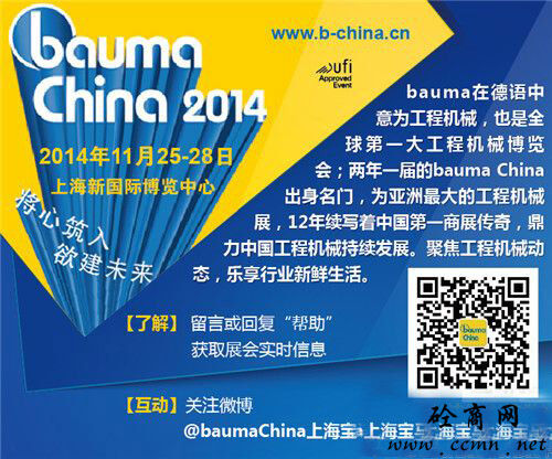 China 2014,11月25-28日行業(yè)翹楚絢麗登陸上海新國(guó)際博覽中心,工程機(jī)械行業(yè)產(chǎn)品全面細(xì)分展示??达L(fēng)云變幻,捕行業(yè)動(dòng)向,我們相約bauma China 2014!