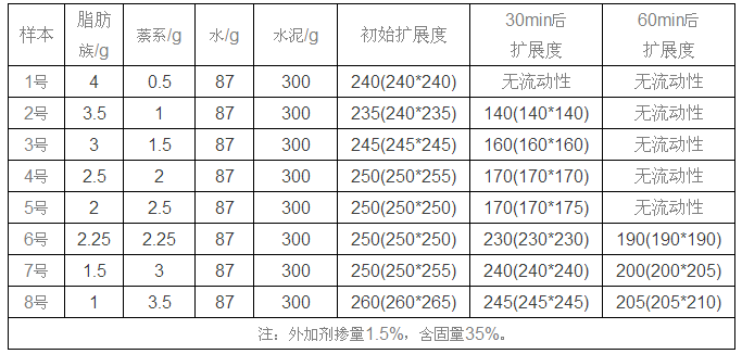 筆者將通過脂肪族與萘系復(fù)配,探討與淮南“海螺牌”水泥的適應(yīng)性實驗,對比兩者的優(yōu)略,從不同的比例中找出效果理想且經(jīng)濟實用的最優(yōu)組合。本次實驗所用的淮南“海螺牌”水泥的熟料使用新型干法旋窯生產(chǎn)P.O42.5普通硅酸鹽水泥,其中三氧化硫含量為2.09%;氧化鎂含量為1.91%;氯離子含量為0.016%;混合材品種為碎屑+煤矸石,摻量12.53%;石膏為脫硫石膏,摻量4.97%,水泥初凝170min,終凝220min。脂肪族為某單位生產(chǎn)的普通脂肪族外加劑,固含量為35%,減水率24%,密度1.195g/cm3。萘系為袋裝萘粉,稀釋到含固量為35%(含固量與脂肪族的相同,方便做對比實驗)。脂肪族外加劑(免加熱型)在合成過程中使用氫氧化鈉提供熱源,導(dǎo)致脂肪族外加劑含堿量相對較高;而萘系在合成過程中,首先加入濃硫酸磺化,在水解中和反應(yīng),因而萘系外加劑中硫酸根離子含量相對較高。