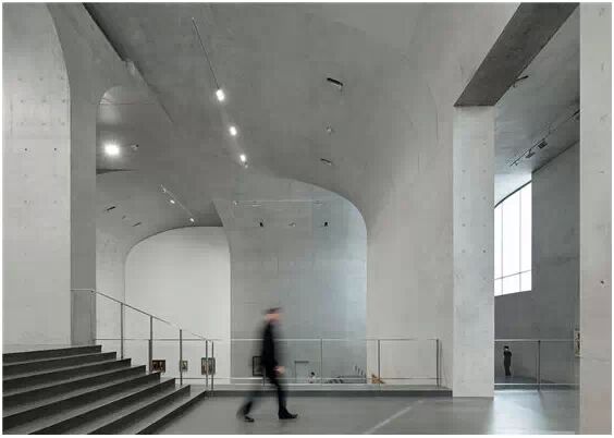 在“傘拱”結(jié)構(gòu)的空腔里,地面以上的“傘拱”覆蓋空間,墻體和天花均為清水混凝土的表面,它們的幾何分界位置也變得模糊。這樣的結(jié)構(gòu)性空間,在形態(tài)上不僅對人的身體形成庇護感,亦與保留的江邊碼頭的煤料斗產(chǎn)生視覺呼應(yīng)。建筑的內(nèi)部空間也得以呈現(xiàn)一種原始的野性魅力,而有著大小調(diào)節(jié)的空間尺度以及留有模板拼縫和螺栓孔的清水混凝土表面又會帶來一種現(xiàn)實感。這種“直白”式的結(jié)構(gòu)、材料、空間所形成的直接性與樸素性,加上大尺度出挑所產(chǎn)生的力量感或輕盈感,使整個建筑與原有場地的工業(yè)特質(zhì)間取得一種時間與空間的接續(xù)關(guān)系。地面以上的清水混凝土“傘拱”下的流動展覽空間和地下一層傳統(tǒng)“白盒子”式的展覽空間由一個呈螺旋回轉(zhuǎn)、層層跌落的階梯空間聯(lián)接,既原始又現(xiàn)實的空間和古代、近代、現(xiàn)代直到當(dāng)代藝術(shù)的展覽陳列,這種并置的張力,呈現(xiàn)出一種具有時間性的展覽空間。