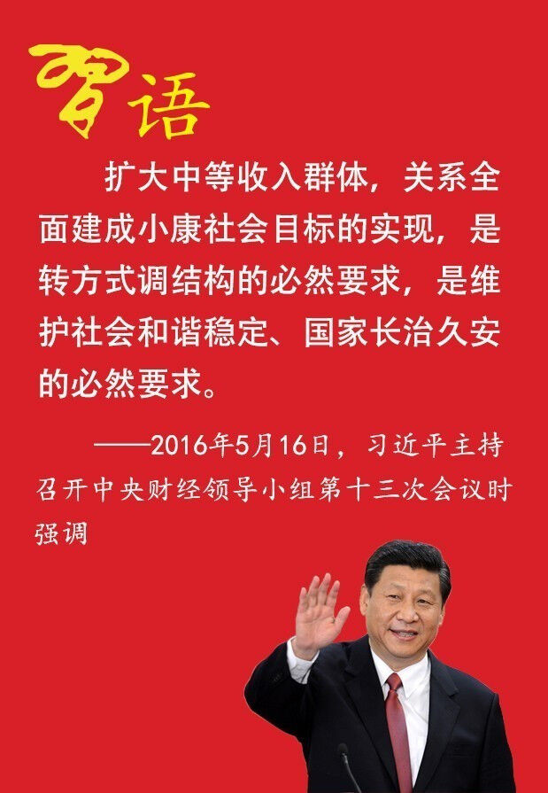 2016年5月16日,習(xí)近平主持召開中央財(cái)經(jīng)領(lǐng)導(dǎo)小組第十三次會議,分別研究落實(shí)供給側(cè)結(jié)構(gòu)性改革、擴(kuò)大中等收入群體工作。他強(qiáng)調(diào)要堅(jiān)持以人民為中心的發(fā)展思想,在全社會大力弘揚(yáng)勤勞致富、艱苦奮斗精神,激勵人們通過勞動創(chuàng)造美好生活,不斷提高生活水平。