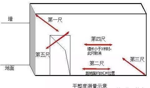 三、表面平整度1、指標說明:反映層高范圍內(nèi)剪力墻、混凝土柱表面平整程度。2、測量工具:2米靠尺、楔形塞尺3、測量方法和數(shù)據(jù)記錄:(1)剪力墻/暗柱:選取長邊墻,任選長邊墻兩面中的一面作為1個實測區(qū)。累計實測實量不少于5個實測區(qū)。(2)當(dāng)所選墻長度小于3米時,同一面墻4個角(頂部及根部)中取左上及右下2個角。按45度角斜放靠尺,累計測2次表面平整度??缍纯诓课槐販y。這2個實測值分別作為該指標合格率的2個計算點。(3)當(dāng)所選墻長度大于3米時,除按45度角斜放靠尺測量兩次表面平整度外,還需在墻長度中間水平放靠尺測量1次表面平整度。跨洞口部位必測。這3個實測值分別作為判斷該指標合格率的3個計算點。(4)混凝土柱:可以不測表面平整度。4、示例: