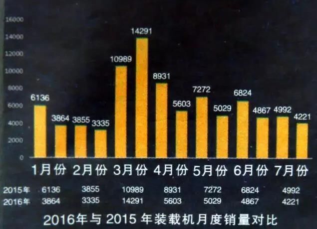 據(jù)公布的數(shù)據(jù),7月份全國26家主要裝載機(jī)生產(chǎn)企業(yè)共銷售各類裝載機(jī)4221臺,同比2015年7月份的4992臺,下降15.44%;環(huán)比6月份的4867臺,下降13.27%。其中3噸及以上裝載機(jī)銷量為3796臺,3噸以下小型裝載機(jī)銷量為425臺。從細(xì)分類型來看,3噸及5噸裝載機(jī)為主力銷售機(jī)型,合計(jì)銷量占比達(dá)到80%。綜合來看前7月銷量,除3月份曇花一現(xiàn)般同比大幅增長30.05%外,其余月份裝載機(jī)銷量均在下滑。但一個積極的現(xiàn)象是,4月份以來裝載機(jī)雖持續(xù)下滑,但降幅一直在收窄,自4月份的37.26%收窄到7月份的15.44%。