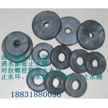 該橡膠止水環(huán)體采用遇水膨脹橡膠制成,它可以是圓型的片狀體,其中間位置的開口應(yīng)根據(jù)是用在對拉螺栓上還是用在對拉環(huán)上的不同,分別制成圓孔或切出一道貫通兩面的長縫(見圖1)。止水環(huán)體的厚度為7~20mm,直徑或邊長為30~80mm。常用的規(guī)格有PZ型,是外經(jīng)尺寸D=40mm,厚度h=10mm,中孔直徑較對拉螺栓直徑小2mm的橡膠圈(根據(jù)水頭高度調(diào)整外形尺寸,環(huán)體厚度或每根螺栓上使用環(huán)數(shù))。在使用時,只要將止水環(huán)緊套于對拉螺栓或?qū)胁考纯桑ㄒ妶D2),最終被埋入現(xiàn)澆混凝土中。當(dāng)建筑物使用時,如一側(cè)有壓力水順螺栓縫隙(由于混凝土自身的干縮性,不可避免)滲至中部時,遇橡膠止水環(huán),止水環(huán)吸水膨脹,形成不透水的塑性膠體,堵塞其周邊的滲水通路,起到止水作用。