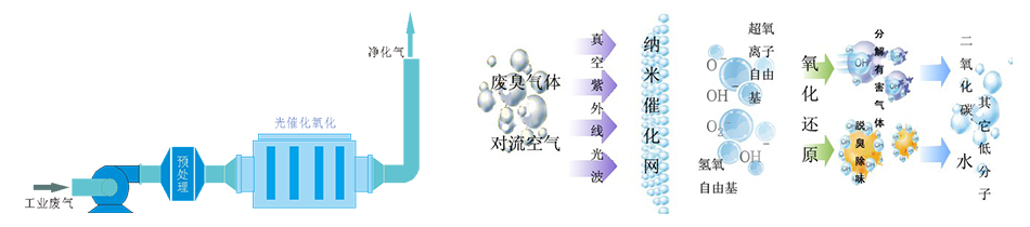 1、利用高能高臭氧紫外線光束分解空氣中的氧分子產(chǎn)生游離氧,即活性氧,因游離氧所攜正負(fù)電子不平衡所以需與氧分子結(jié)合,進(jìn)而產(chǎn)生臭氧。UV+O2→O-+O*(活性氧)O+O2→O3(臭氧),眾所周知臭氧對(duì)有機(jī)物具有極強(qiáng)的氧化作用,對(duì)有機(jī)氣體及其它刺激性異味有立竿見(jiàn)影的清除效果。有機(jī)性氣體利用排風(fēng)設(shè)備輸入到本凈化設(shè)備后,運(yùn)用高能紫外線光束及臭氧對(duì)有機(jī)(異味)氣體進(jìn)行協(xié)同分解氧化反應(yīng),使有機(jī)氣體物質(zhì)其降解轉(zhuǎn)化成低分子化合物、水和二氧化碳,再通過(guò)排風(fēng)管道排出室外。