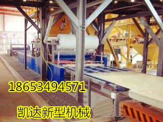 勻質板設備產品在連續(xù)生產線連續(xù)同步完成發(fā)泡、固化、覆膜過程。面層軋壓設備用于將面層材料軋壓成設計所需要的花紋或圖形;反應灌注機用于a料、b料按工藝要求的比例計量混合;移動澆注機用于將混合的ab料及泡沫以往復移動的方式覆蓋在下層面材上;層壓機上下各一臺,用于原料在上下層移動鏈板間固化、定型;熱風循環(huán)裝置用于層壓機內部的加溫;貼側邊紙和側邊輸送機用于板材測邊擋料,修邊機用于改性eps防火保溫板板兩側修邊;自動跟蹤機用于將板材切斷成定長;生產方式為連續(xù)不間斷,生產效率高,產品質量穩(wěn)定,板材密度均一。