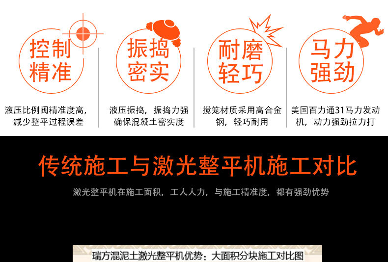 奧力德激光整平機是根據現(xiàn)代工業(yè)廠房、大型商場、 及其他大面積水泥混凝土地面等對地面質量如 、平整度、水平度等越來越高的需求而研制的。使用精密激光整平機鋪注整平的水泥混凝土地面,較按常規(guī)方法所鋪注的地面質量要好得多——地面平整度及水平度提高3倍以上,密實度及強度提高20%以上。同時還能夠提高工效超過50% , 并節(jié)省約35%的人工。此外,它能容易地鋪注高強 、低坍落度混凝土和纖維泥凝土。其激光系統(tǒng)配備多種自動控制元件,以每秒10次的 實時監(jiān)測整平頭的標高,確保鋪注的地面平整度和水平度得到有效的控制。同時,其強力振動器振動頻率達4000次/分鐘,確?;炷琳駬v密實,使整個鋪注的混凝土基體均質、致密