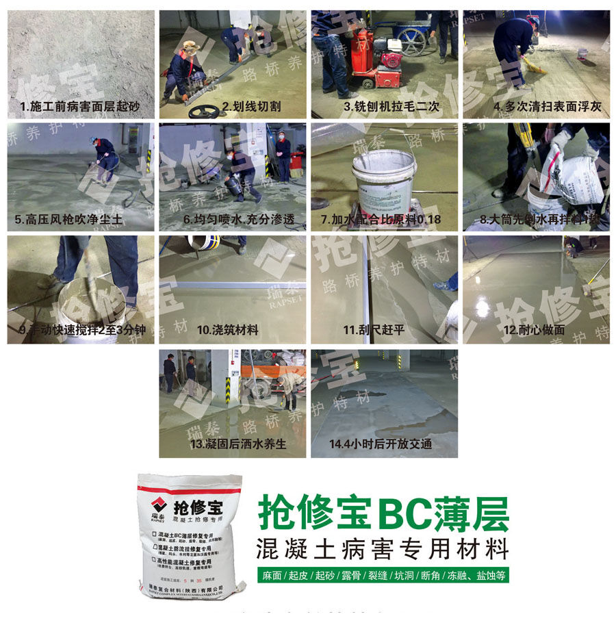 出現這些問題的主要原是因為施工質量和產品本身的使用壽命問題,那么針對這種問題,地坪在修補處理基層時應該選擇什么材料呢?首先應考慮快速材料,因為是地下停車場,車輛需要頻繁進入駛出;其次針對起塵、起砂、脫落的微表處病害,選擇針對微表處病害的修補材料。搶修寶BC薄層就是一個不錯的選擇,材料本身強度高,內含進口膠粉,可以和病害部位嚴絲合縫的結合起來,其次加入了進口添加劑,材料可以30分鐘完成初凝,2-4小時就可以恢復交通,解決了車輛進出頻繁引起的交通擁堵,是地坪修補基層處理的的不錯的選擇!