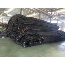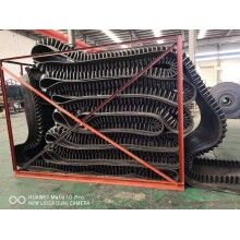 大傾角擋邊輸送帶的基帶是由上覆蓋膠、下覆蓋膠、帶芯和橫向剛性層四部分組成。上覆蓋膠厚度一般為3-6mm;下覆蓋膠厚度一般為1.5-4.5mm,帶芯材料承受拉力,其材料可以是棉帆布(CC)、尼龍帆布(NN)、聚酯帆布(EP)或鋼繩芯(ST)。為了增加基帶的橫行剛性,在芯體上下添加特殊加強(qiáng)層,稱橫向剛性層。基帶的寬度規(guī)格,與普通膠帶相同,符合GB7984-2001的標(biāo)準(zhǔn)規(guī)定。