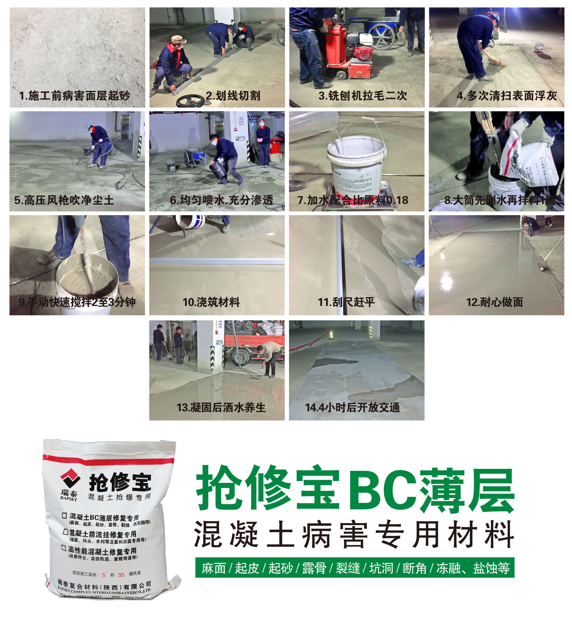 搶修寶混凝土路面修補(bǔ)料是由特種水泥、硅酸鹽水泥、高分子聚合物、功能性添加劑、早強(qiáng)纖維及精選骨料組成,為高分子改性水泥基復(fù)合材料,既有水泥基材料的耐久性,又有聚合物材料良好的內(nèi)聚力和柔韌性,并具有補(bǔ)償收縮的特性。其主要特點(diǎn)是15分鐘凝固,1小時(shí)抗壓強(qiáng)度達(dá)到30Mpa,達(dá)到快速通車的要求,且后期強(qiáng)度不倒縮!