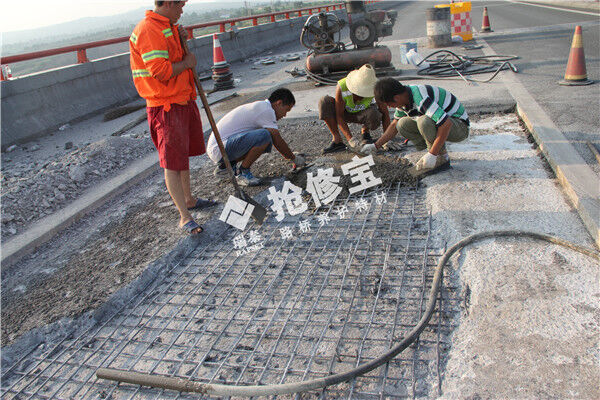 由于時間要求快,應(yīng)采用混凝土特種材料進行搶修,路橋養(yǎng)護特材——搶修寶RT-2,30分鐘速凝,2小時可通行,早期強度高、后期強度不倒縮,粘結(jié)能力強,是治理橋梁路面鋪裝層病害常備的特種建材,采用風(fēng)鎬對鋪裝層病害進行清除,破碎時注意水平方向分離鋪裝層與梁板,不能影響梁板的狀態(tài)和質(zhì)量,對梁板頂要清除整潔,用氣泵或高壓水對梁板頂進行沖洗,不積水不滲漏的情況下,采用搶修寶RT-2特種水泥與標(biāo)準(zhǔn)石子按照要求配比,加水?dāng)嚢?,迅速澆注到病害部位,抹至與路面齊平時,灑水量水進行收光,指甲掐不動混凝土?xí)r進行養(yǎng)護,2小時后即可通行。避免大面積換板,降低了工程成本。施工無需動用大型機械,對交通安全影響不大。
