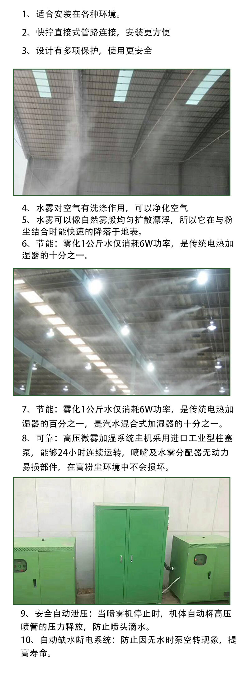 7.可靠:高壓微霧加濕系統(tǒng)主機采用進口工業(yè)型柱塞泵,能夠24小時連續(xù)運轉(zhuǎn),噴嘴及水霧分配器無動力易損部件,在高粉塵環(huán)境中不會損壞