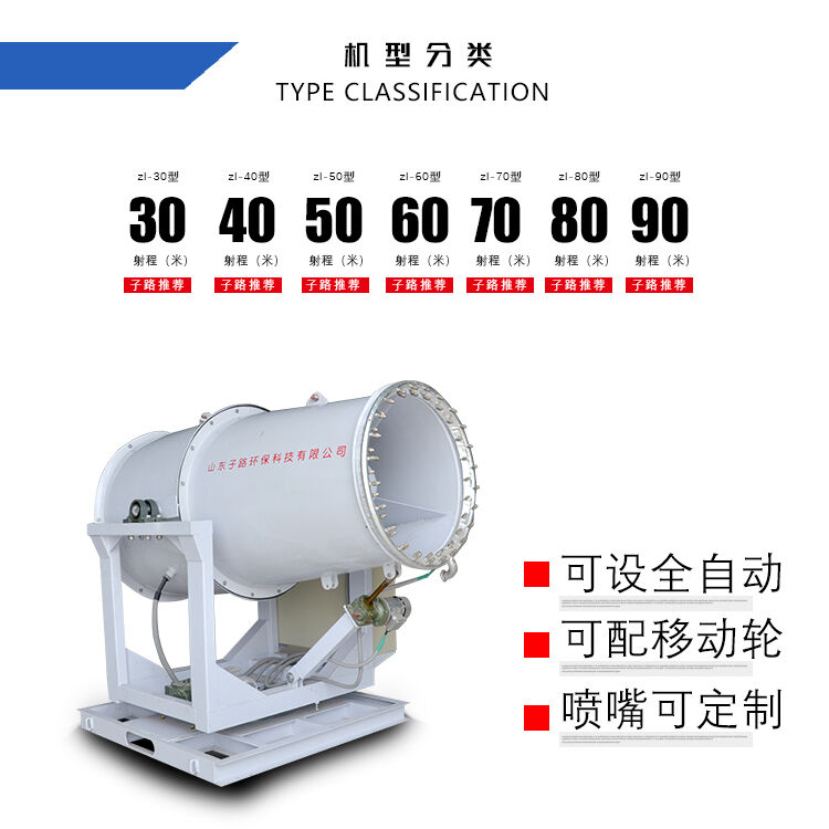 直徑相近的水霧和的粉塵顆粒黏貼,減小水表面的張力,使粉塵顆粒與水霧聚結(jié)成團(tuán),在重力作用下,然后沉降到地面。達(dá)到有效降塵的目的。霧炮機(jī)的噴水距離為30到150米,具體規(guī)格可以定制,配套水箱可選3-10噸,主要作用是噴霧抑塵,