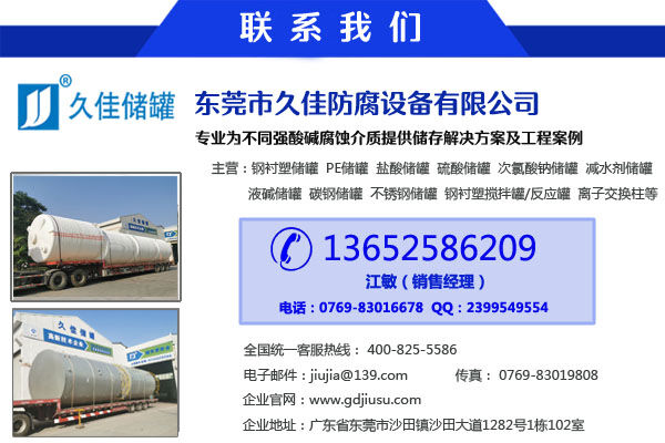 東莞市久佳防腐設(shè)備主營(yíng)產(chǎn)品有鋼襯塑儲(chǔ)罐、全塑儲(chǔ)罐、碳鋼儲(chǔ)罐、離子交換柱、攪拌罐等防腐設(shè)備,主要有鋼襯塑和全塑兩大系列,分臥式和立式,品種齊全,可滿足客戶的需求,廣泛應(yīng)用于化工、環(huán)保、電力、釀造、儲(chǔ)存、運(yùn)輸?shù)刃袠I(yè)。