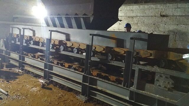 3)第三種方法是將刮板輸送機(jī)固定在板式給料機(jī)下面的水泥基礎(chǔ)溝槽內(nèi),漏料通過漏斗進(jìn)入刮板輸送機(jī)內(nèi)。