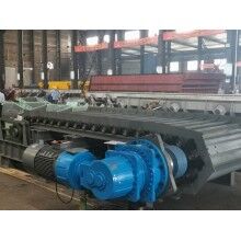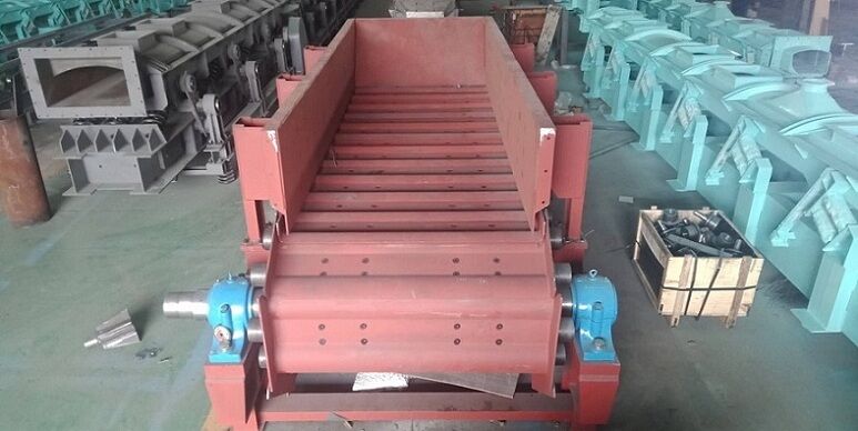 通過分析研究上述問題,結合國內外給料機使用情況,重新設計制作了一臺新型給料機,主要特點是:采用板式給料機連續(xù)給料;板式給料機料板采用雙圓弧、節(jié)點重合的方式,解決了漏料問題;板式給料機安裝角度為18°,可使物料緩慢分散跌落到皮帶機上;撥料棍采用逆物料方向旋轉,以控制物料層的厚度;料斗設計采用漸開式,解決了膨料問題;電機采用變頻控制,可控制出料速度。經過三個多月的的現(xiàn)場使用,證明能夠完成勻料,效果較好。