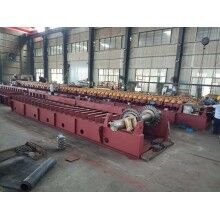 座部件由機架和支承件組成。機架由鋼材焊接而成,支承部件有支重輪、下托輪和縱向導軌,輸送板得到支重輪和縱向導軌的雙重支持,使支重更均勻合理。牽引鏈基本上不受礦石和自重產生的張力作用,支重輪外側設計有凸臺,與主、從動輪聯(lián)合作用,成功地杜絕鏈軌跑偏。在機架下方設有下托輪,為方便維修,下托輪為側裝式。