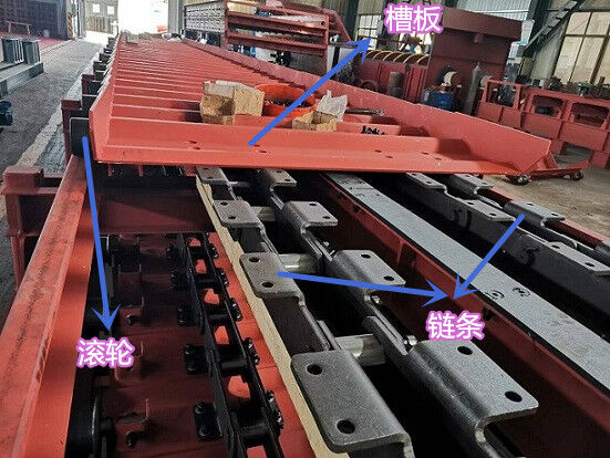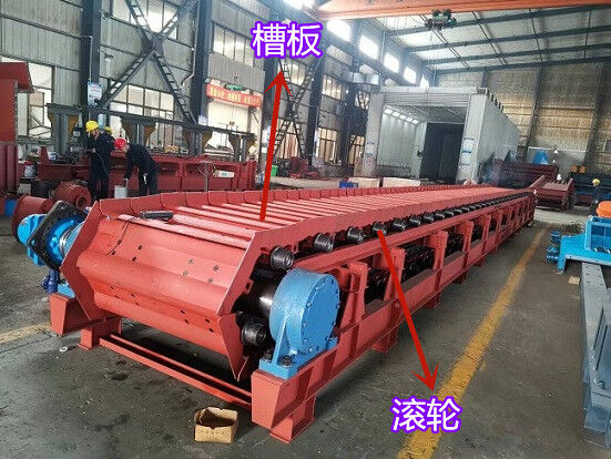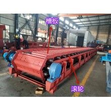 板式給料機(jī)運行部件由牽引鏈條,承載構(gòu)件行走滾輪和輸送槽板等組成。