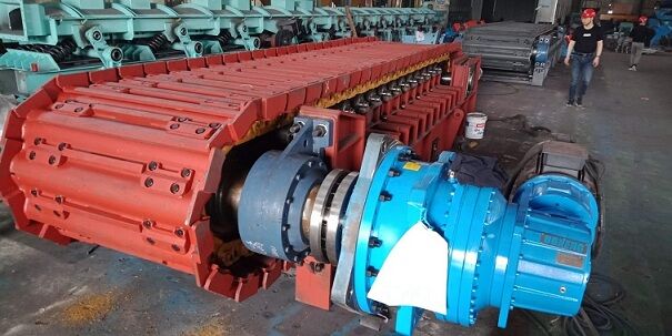 鏈板組件直接承受礦倉(cāng)物料壓力和運(yùn)送物料。鏈板組件由輸送板、牽引鏈軌及其聯(lián)接螺栓組成。輸送板采用搭接式結(jié)構(gòu)。輸送板材質(zhì)為高錳鋼,鑄造成型,相互搭接,輸送板用螺栓固定在鏈軌上。這種板不僅重量輕、不漏礦,而且強(qiáng)度高、耐磨損、抗沖擊。