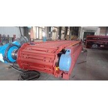 整機(jī)的工作原理為:設(shè)備安裝于料倉(cāng)下,料倉(cāng)底部物料直接壓在設(shè)備的鏈板組件上,料倉(cāng)的前部有寬度為1.8m的開(kāi)口,當(dāng)動(dòng)力部件帶動(dòng)主軸旋轉(zhuǎn)時(shí),鏈板組件隨之在料倉(cāng)下向前移動(dòng),帶動(dòng)料倉(cāng)底部物料通過(guò)缺口移出料倉(cāng),物料到主軸處鏈板組件改向時(shí)下落,完成物料的輸送工作。主軸下部可設(shè)破碎機(jī),也可直接設(shè)帶式輸送機(jī),對(duì)物料進(jìn)行下一步的長(zhǎng)距離輸送。