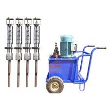 發(fā)潤牌劈裂機(jī)的速度是破碎錘的速度的7~8倍,大大縮短了工期。這個(gè)機(jī)器使用很簡單,一個(gè)工人就能完成全部操作,其結(jié)構(gòu)就是一個(gè)高壓泵站加上輸油管連接的劈裂槍,使用的時(shí)候先在需要分裂的巖石上打一個(gè)50到100公分深的孔,然后插入劈裂槍,啟動(dòng)機(jī)器,大約30到60秒,石塊即被裂開一條100公分左右長度,1.5公分寬度的裂縫。機(jī)器原理就是利用劈裂槍中間的楔塊伸縮,推動(dòng)包圍楔塊的兩片劈塊往周圍張開,從而由內(nèi)部脹開巖石。