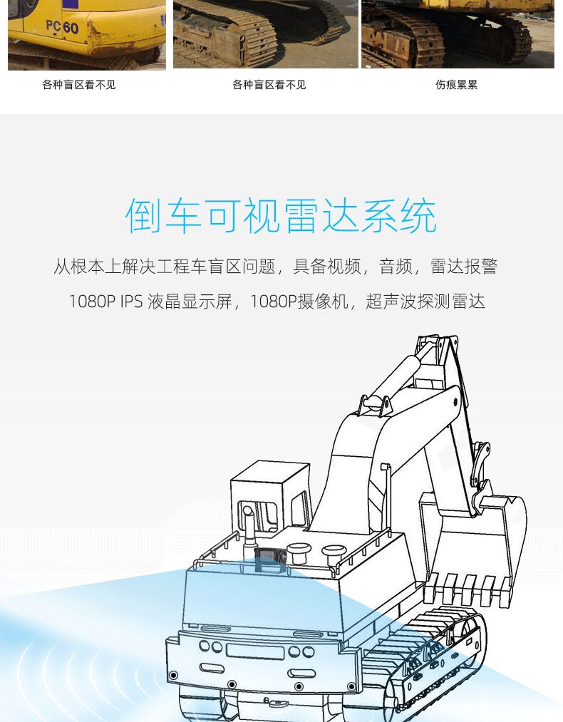 本產(chǎn)品是針對(duì)大型機(jī)械和卡車(chē)貨車(chē)倒車(chē)視野不好的環(huán)境設(shè)計(jì)和制作的倒車(chē)?yán)走_(dá)。通過(guò)攝像頭將車(chē)后環(huán)境通過(guò)視屏直接顯示到顯示屏上,讓駕駛員直觀了解車(chē)后環(huán)境;另外,超聲波探頭精確探測(cè)車(chē)后障礙物距離,并且在顯示屏顯示障礙物距離并發(fā)出其它警示信號(hào)。從而使駕駛者在探測(cè)范圍內(nèi)能方便地判斷車(chē)后障礙物的距離、方位和所在區(qū)域,得到及時(shí)警示,達(dá)到安全倒車(chē)的目的。此款產(chǎn)品具有防水、防震、防干擾,探測(cè)距離遠(yuǎn)等優(yōu)點(diǎn)。
