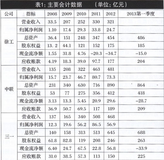 分析表3中數(shù)據(jù),參考近年三駕馬車資金投向,隱含在數(shù)據(jù)后面的一個事實(shí)就浮出水面:經(jīng)過幾年布局,各有斬獲后,出于做大做強(qiáng)企業(yè),保優(yōu)勢、補(bǔ)短板需要,挖掘機(jī)市場將是徐工、中聯(lián)的發(fā)力點(diǎn);徐工還將全面進(jìn)入混凝土機(jī)械市場,2012年報(bào)顯示,其占比首次達(dá)到12%;三一則必然會在起重機(jī)市場加在投入,另外其路面機(jī)械也對徐工形成沖擊態(tài)勢。作為行業(yè)領(lǐng)跑者,三駕馬車都在投巨資、博市場,期待追平或拉開與對手的距離。這就是三駕馬車現(xiàn)金流量表中,投資活動現(xiàn)金流量長期負(fù)數(shù)的主要原因。