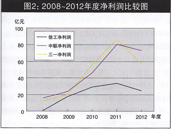 分析工程機(jī)械上市公司三駕馬車5年主要會計(jì)數(shù)據(jù)表明(見表1):中聯(lián)連續(xù)5年實(shí)現(xiàn)營業(yè)收入增長,徐工、三—在實(shí)現(xiàn)4年?duì)I業(yè)收入連續(xù)增長后,2012年?duì)I業(yè)收入出現(xiàn)負(fù)增長。從表1可知,三家上市公司凈利潤指標(biāo),均在實(shí)現(xiàn)連續(xù)4年上漲后,于2012年同時出現(xiàn)負(fù)增長。從圖1、圖2可見三駕馬車2008年、2012年?duì)I業(yè)收入、凈利潤排名一致,分別是中聯(lián)、三一、徐工,而在五年中的2009、2010、2011三年,以上排名互有消長。比較主營業(yè)務(wù)十分接近的兩家上市公司三一和中聯(lián),我們發(fā)現(xiàn):在五年之中,當(dāng)GDP增長率走高時,三一的主營業(yè)務(wù)收入增長率、凈利潤增長率高于中聯(lián),在經(jīng)濟(jì)下行壓力增大,GDP增長率走低時,中聯(lián)的收入增長,具有相對穩(wěn)定性(見圖1)。