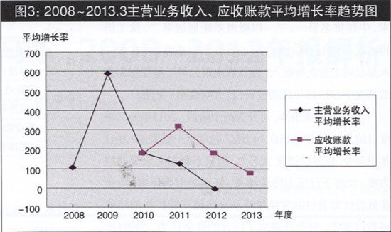 圖3 2008~2013.3主營業(yè)務(wù)收入、應(yīng)收賬款平均增長率趨勢圖