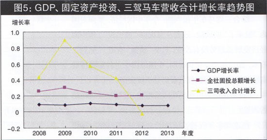 圖5 GDP、固定資產(chǎn)投資、三駕馬車營收合計(jì)增長率趨勢圖