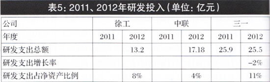 分析2011、2012年報(bào)表明,三一2012年研發(fā)投入25.5億元,占公司凈資產(chǎn)的11%,比2011年減少2%,研發(fā)投入出現(xiàn)下降趨勢;2012年,徐工研發(fā)投入13.2億元,占凈資產(chǎn)的8%;中聯(lián)研發(fā)投入17.18億,占凈資產(chǎn)的4%;徐工、中聯(lián)研發(fā)投入和占比,均低于三一(見表5)。由此可知,在打造公司核心競爭力,提升公司價值方面,三駕馬車研發(fā)投入的趨勢和占比均存在提升的空間。