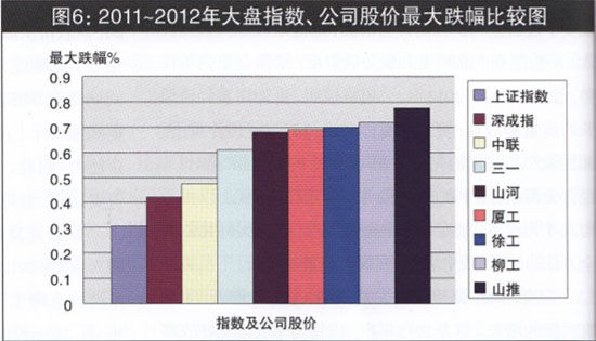 2011年,行業(yè)遭遇寒冬,三駕馬車營業(yè)收入合計(jì)增三率與宏觀經(jīng)濟(jì)指標(biāo)對比,呈加速度下跌態(tài)勢,而且在資本市場的表現(xiàn)弱于滬深大盤指數(shù)。2011年~2012年間,其股價從最高點(diǎn)至最低點(diǎn),下跌47.3%、61.2%、69.8%不等;而同期上證指數(shù)下跌幅度只有30.67%,深成指下跌42.1%。盡管與行業(yè)內(nèi)其他上市公司同期資本市場表現(xiàn)相比,工程機(jī)械行業(yè)三駕馬車的表現(xiàn)仍有亮點(diǎn),但其同期跌幅大于上證和深成指跌幅,仍然令公司形象受損,影響資本市場再融資能力。因此,打造公司核心競爭力,提升公司投資價值,提振資本市場投資者信心,至關(guān)重要(大盤指數(shù)、公司股價最大跌幅比較圖,見圖6)。