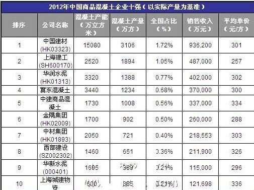 2012中國(guó)商品混凝土企業(yè)十強(qiáng)(以實(shí)際產(chǎn)量為基準(zhǔn))