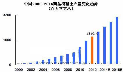 中國(guó)商品混凝土市場(chǎng)自2000年開始,增長(zhǎng)就大幅度提升,2000-2012年平均增幅高達(dá)30%左右。但受全球經(jīng)濟(jì)危機(jī)的影響,中國(guó)2008年的商品混凝土市場(chǎng)也受到了不小的沖擊,商品混凝土的增長(zhǎng)率大幅度下滑。不過(guò)與歐盟、美國(guó)等其他發(fā)達(dá)國(guó)家混凝土負(fù)增長(zhǎng)率而言,中國(guó)混凝土市場(chǎng)表現(xiàn)的還是十分活躍的。這也反映出了中國(guó)的商品混凝土行業(yè)進(jìn)入高速發(fā)展時(shí)期的特征。但中國(guó)市場(chǎng)目前的市場(chǎng)狀況十分紊亂,行業(yè)內(nèi)需要進(jìn)行一番整合,清理一些市場(chǎng)上不規(guī)范的企業(yè),相信整合后對(duì)我國(guó)商品混凝土行業(yè)將起到較大的推動(dòng)作用。中國(guó)混凝土網(wǎng)預(yù)計(jì)“十二五”期間,預(yù)拌混凝土產(chǎn)量還將有小幅增長(zhǎng),到2016年中國(guó)預(yù)拌混凝土產(chǎn)量將突破30億立方米,混凝土行業(yè)將邁上一個(gè)新的臺(tái)階,但總體行業(yè)回歸平穩(wěn)狀態(tài)。