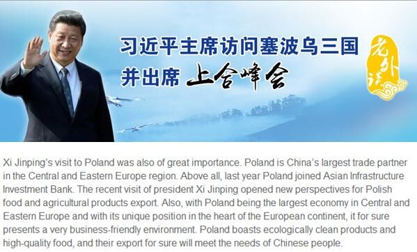習(xí)近平對波蘭的訪問同樣意義大重大。波蘭是中國在中東歐地區(qū)的最大貿(mào)易伙伴。去年,波蘭也加入了亞洲基礎(chǔ)設(shè)施投資銀行。習(xí)主席的這次訪問將為波蘭的食品和農(nóng)產(chǎn)品出口開拓新的局面。此外,波蘭是中東歐最大的經(jīng)濟(jì)體而且位于歐洲心臟地帶,它一定能提供非常有利的經(jīng)商環(huán)境。波蘭還提供生態(tài)潔凈的產(chǎn)品和高質(zhì)量的食品,它們的出口肯定會滿足中國人民的需要。